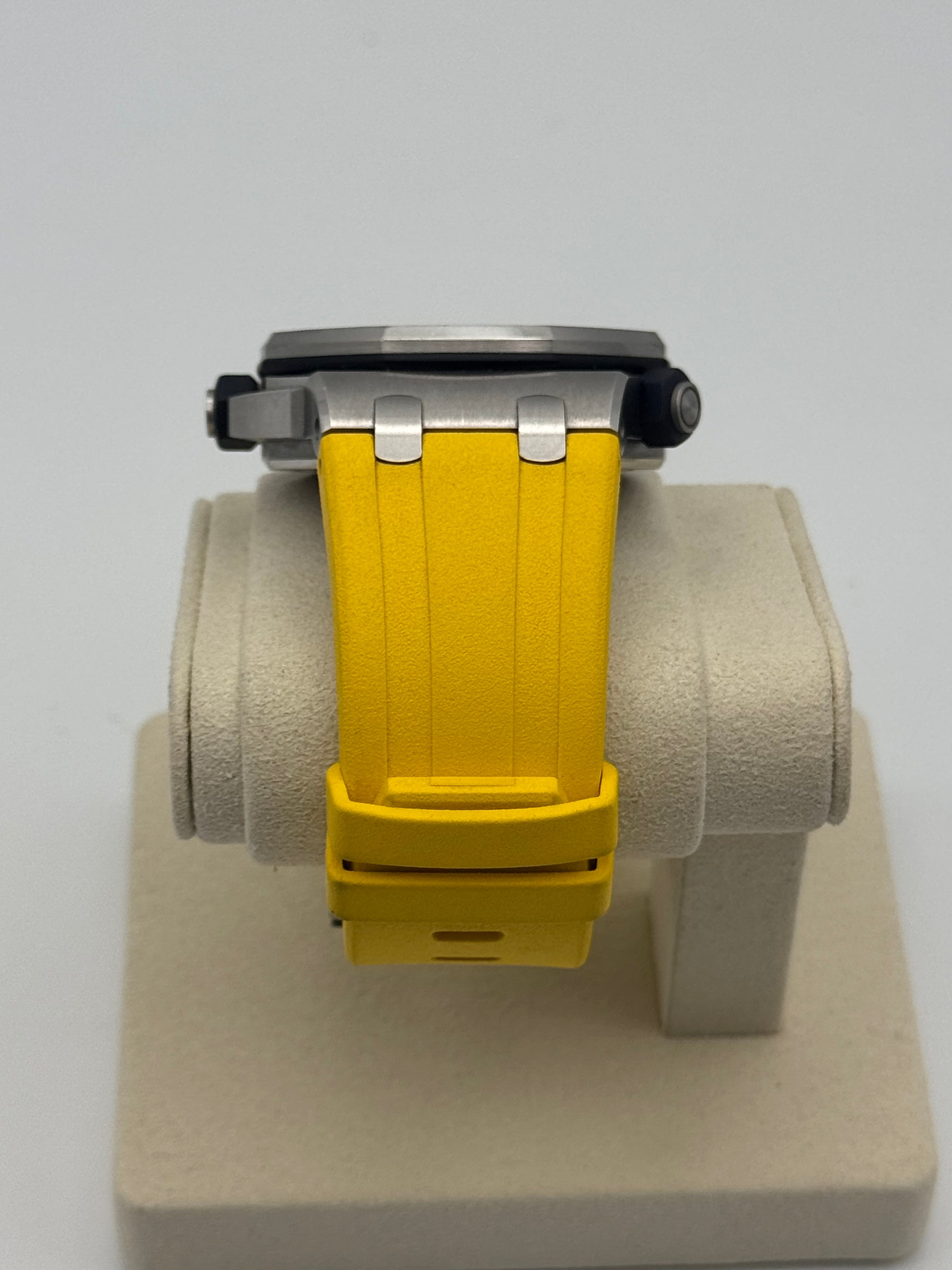 Condition: Used, good condition with minor signs of wear on the case and slightly more signs of wear on the bezel. The yellow strap, the clasp, and the second, black and dark blue strap are also in good to very good condition.