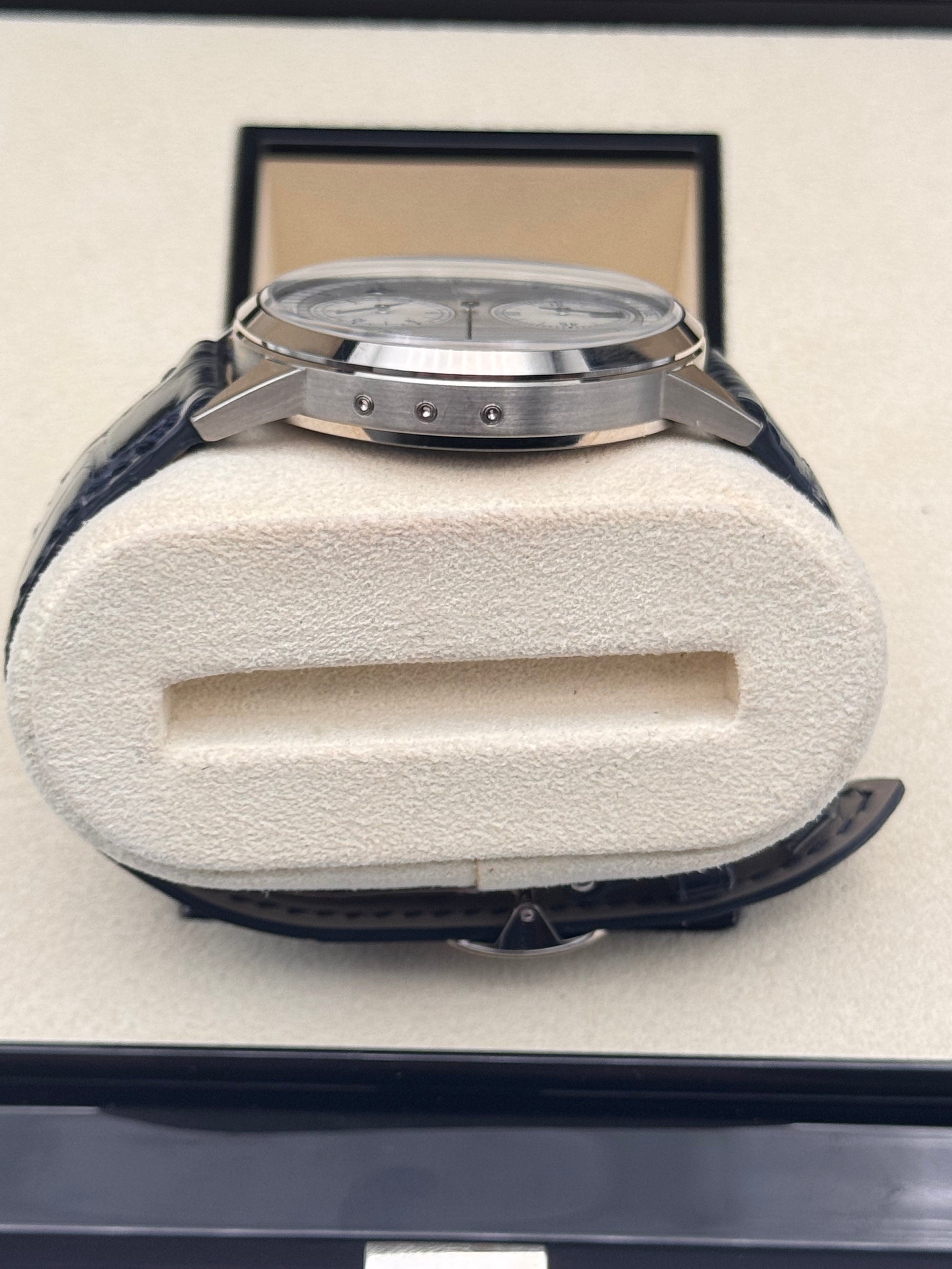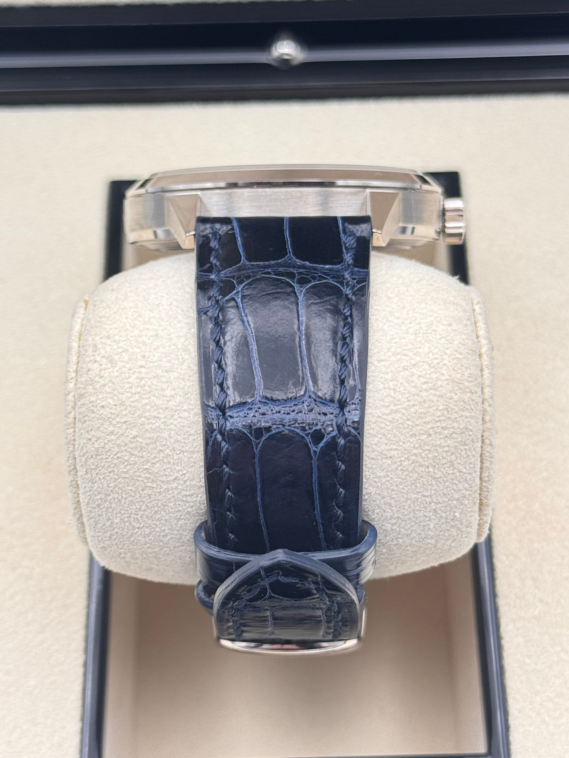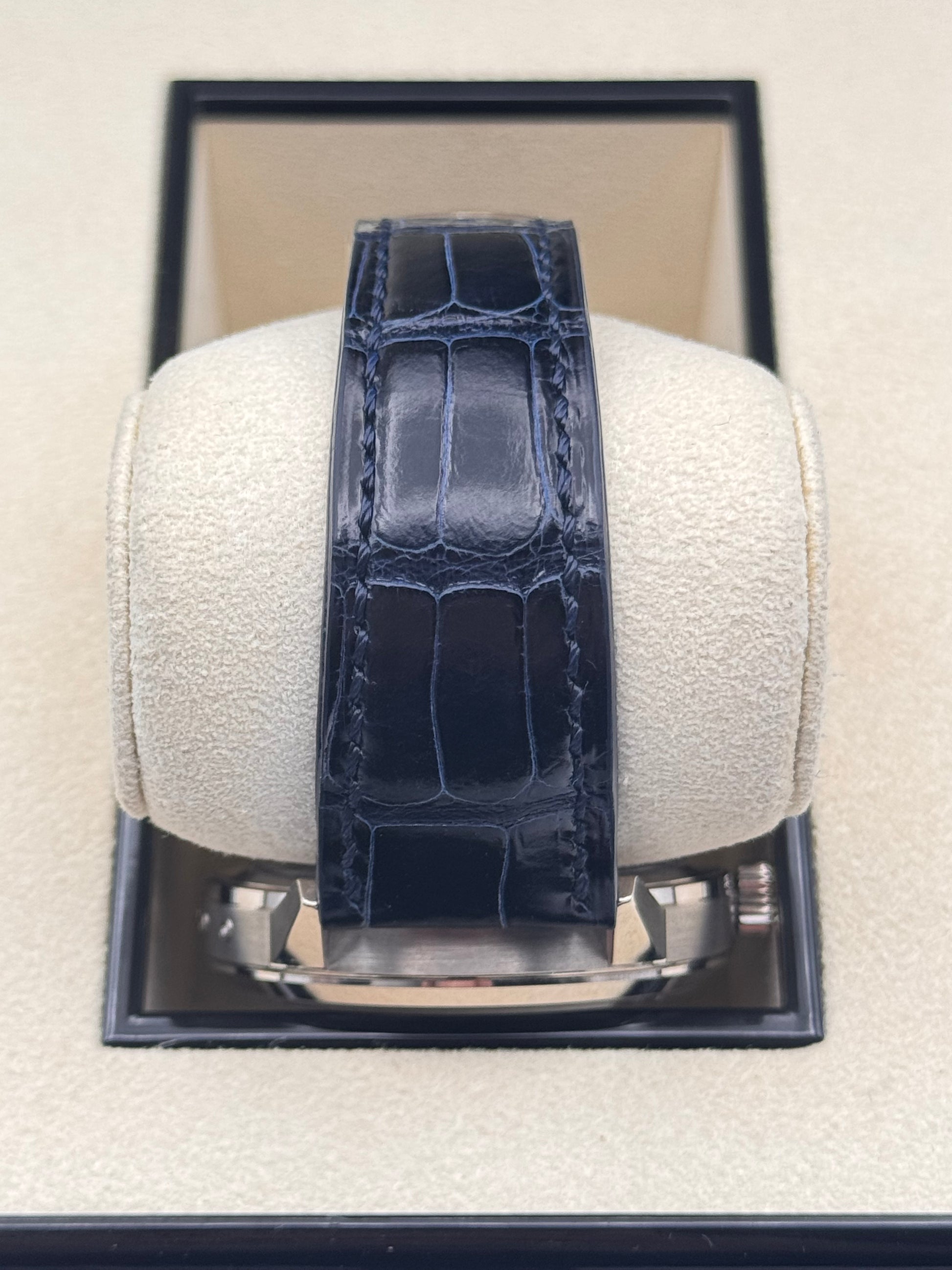 Model: Annual Calendar Regulator; 40,5 mm Weißgoldgehäuse am Lederarmband mit Weißgold Faltschließe